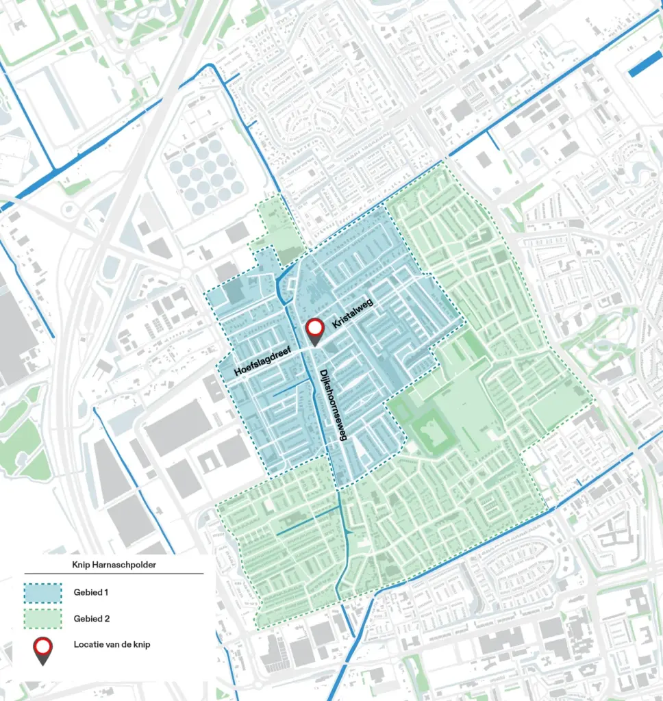 De verkeersknip voorkomt doorgaand verkeer tussen Den Hoorn, Prinses Beatrixlaan en de A4. Ook bouwverkeer kan niet meer door de knip rijden. Alle adressen in de Harnaschpolder blijven bereikbaar via andere wegen.